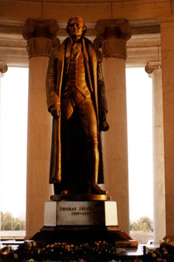 The statue stands 19 feet tall and is hollow bronze on a 6 feet high pedestal of black Minnesota granite. In it, sculptor Rudulph Evans showed Jefferson in a coat that was a gift from his friend Thaddeus Kosciuszko, a general from Poland. Evans' design was picked from over 100 entries in a nationwide competition.